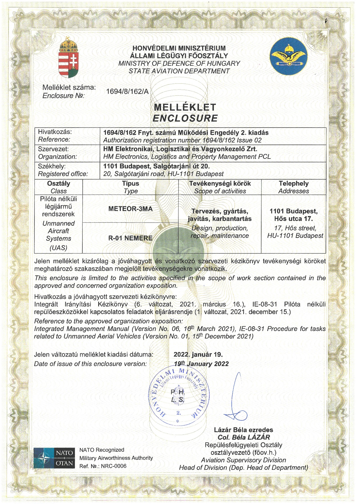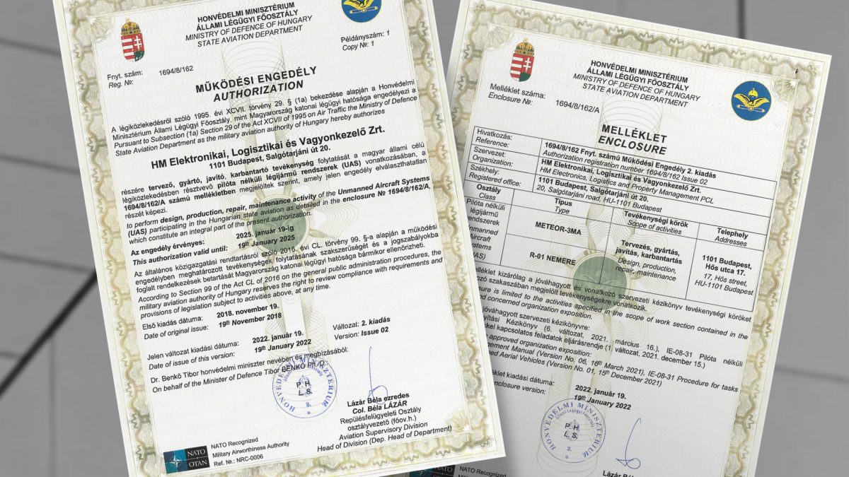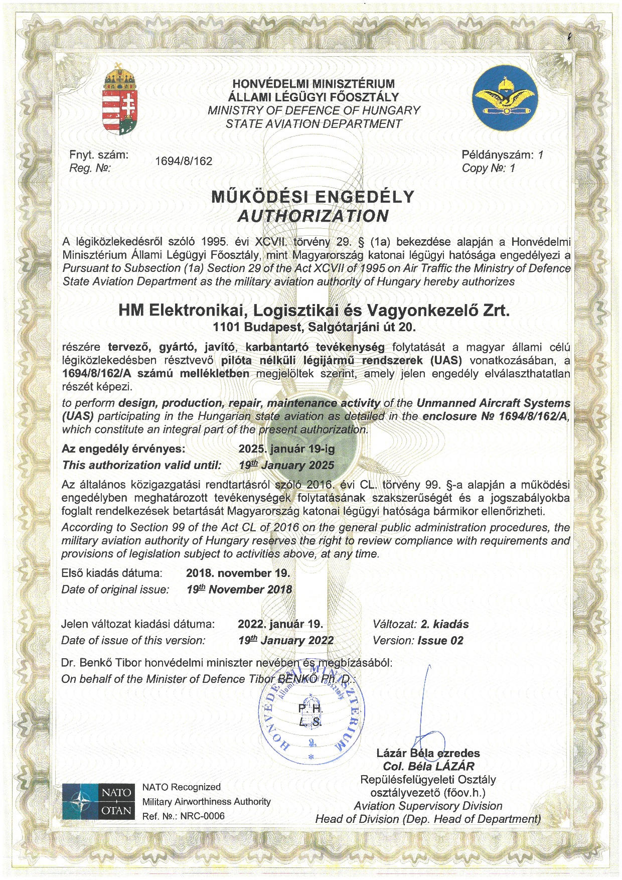 Büszkék vagyunk, hogy Repülési Divíziónk pilóta nélküli repülőeszközöket gyártó műhelye 2022 januárjában ismét megkapta hároméves Működési Engedélyét a HM Állami Légügyi Főosztálytól.
